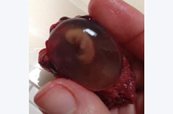 “I had a miscarriage on Palm Sunday last year. We think he was a boy and named him David Raphael. My only prayer when the doctor told me at 11 weeks that my baby had died a month earlier (at 7 weeks gestation), was that I would have something to bury. The doctor said he would either be too small to find or that his fragile body would be crushed in the miscarriage process and there wouldn’t be anything left. On Palm Sunday afternoon he came out. The entire sac was in tact and there he was still floating in the amniotic water. I took a picture so I wouldn’t forget that moment and how God answered my prayer. I think it would be an amazing photo to show people contemplating abortion. Even though he was only 7 weeks when he died, you can see his little arms and legs forming. My 4 year old was looking through my phone when I wasn’t looking one day and found the picture. He came up to me with it and asked me whose baby it was. Even a child can tell that at 7 weeks, the fetus is a little person.”