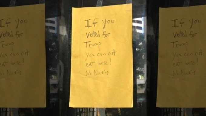 A café in Honolulu called Café 8 ½ posted a sign that read: “If you voted for Trump you cannot eat here! No Nazis.”
