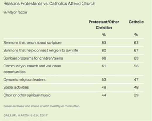 I was encouraged to see that Protestants overwhelmingly are looking for “sermons that teach about Scripture,” and “sermons that help connect religion to own life” over other things. Even good things like children’s ministries, social activities, and music didn’t come close to the desire for good sermons. This should be an encouragement to every pastor to pour himself into his work of studying and preparing his sermon each week.